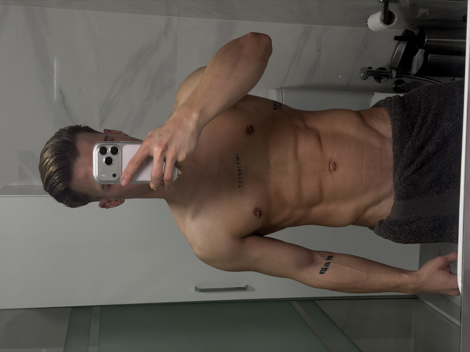 A male individual, appearing to be an adult, is captured in a mirror selfie within what appears to be a modern bathroom