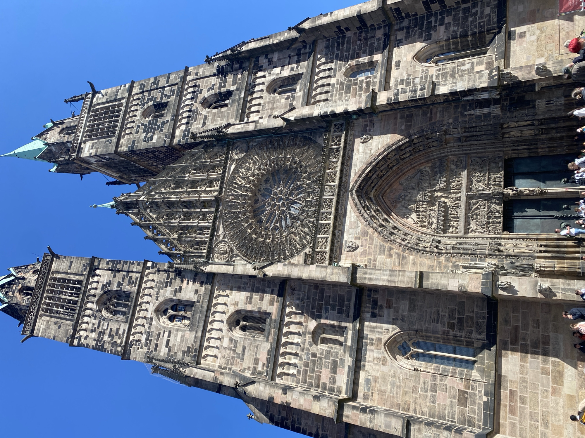 Saint Lorenz Church, a major church in Nuremberg, Germany, viewed from below at a tilted perspective