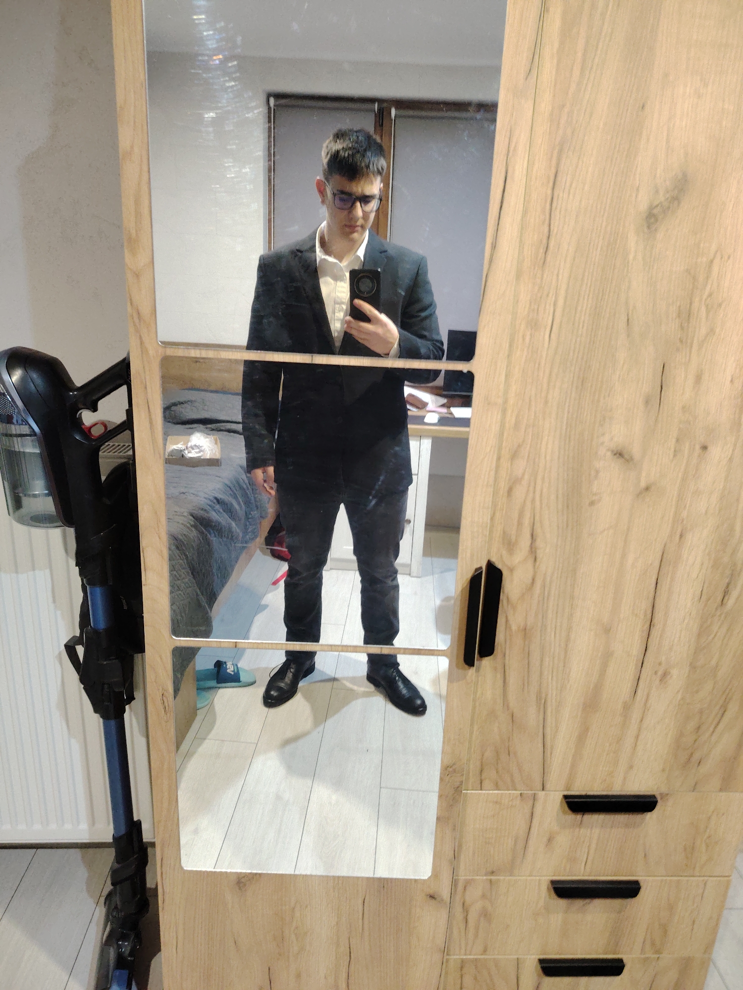 A person wearing a black suit, white shirt, and glasses is taking a selfie in a mirror. The mirror is attached to a light-colored wooden wardrobe with black handles. In the background, a bed with a gray duvet, a nightstand, and a window can be seen. To the left of the wardrobe, a black and blue vacuum cleaner stands against a wall. The location is Panagyurishte, Bulgaria.