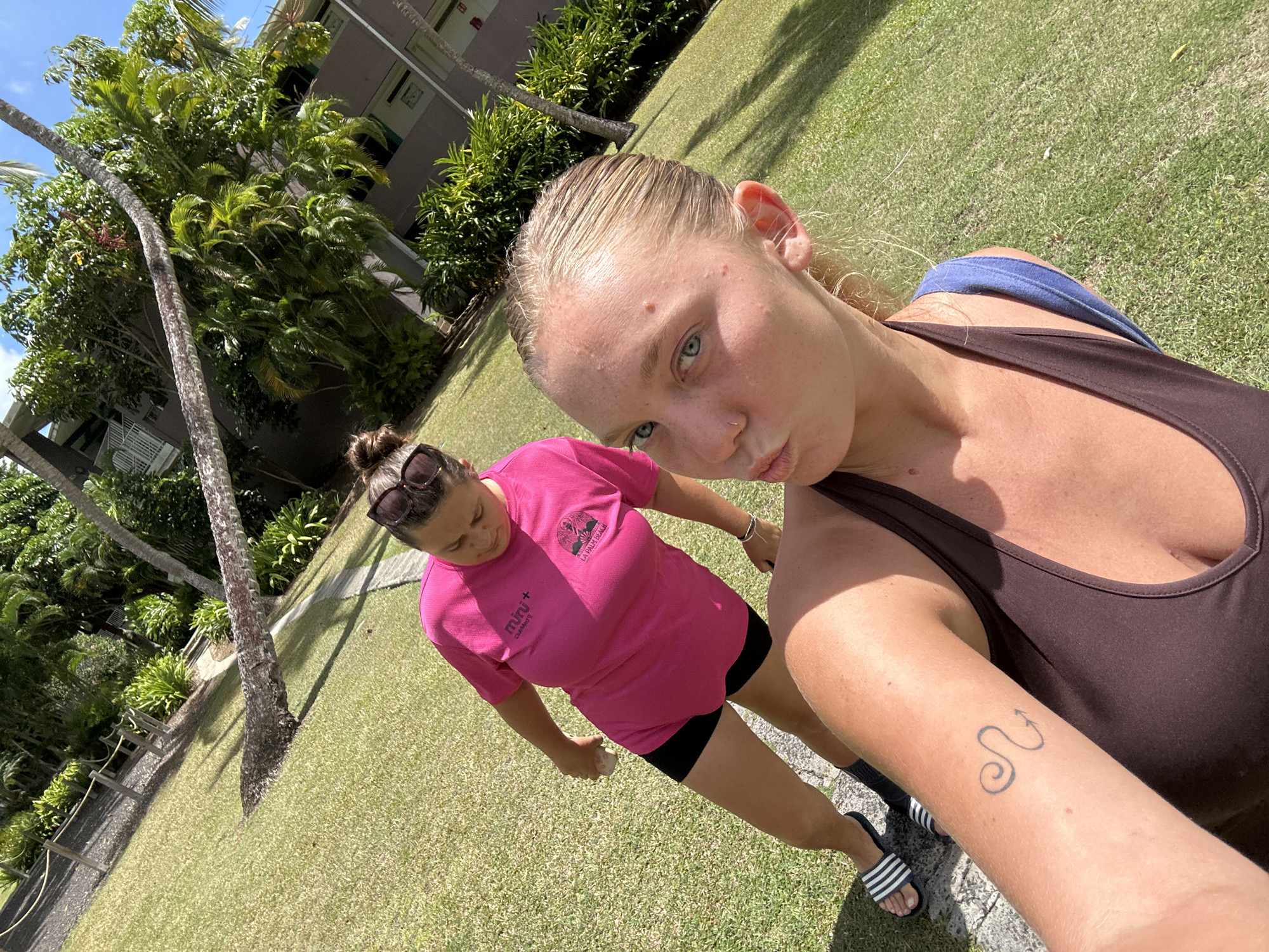 Two women are outdoors on grass. One woman is fair-skinned with blonde hair pulled back, wearing a brown tank top, and has a tattoo on her left forearm. She is taking a selfie. The other woman is fair-skinned with brown hair pulled back, wearing sunglasses, a pink t-shirt, and black shorts. The background includes palm trees, buildings, and other greenery. The location is possibly Sainte-Anne, France, though there is no explicit confirmation.