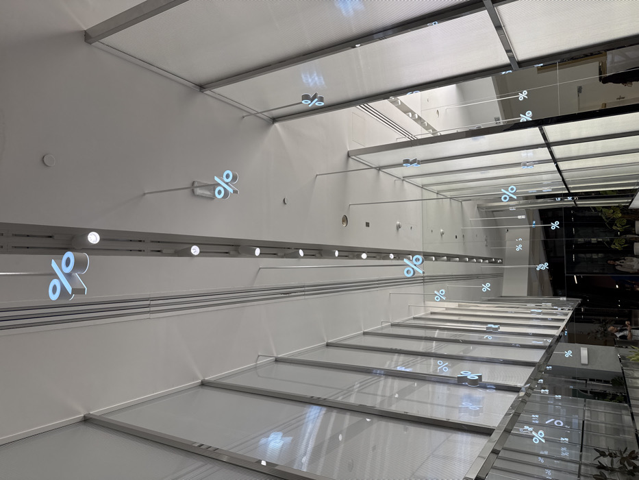 The image depicts the interior of a % Arabica coffee shop, located within the Place Vendôme Mall in Lusail, Qatar. The scene is a brightly illuminated, high-ceilinged corridor or open space. Numerous light blue, three-dimensional percent (%) symbols, the brand's logo, are suspended at various heights from the white ceiling. The ceiling also features recessed circular downlights arranged in linear tracks. Tall, vertical panels, some reflective and some with a textured, vertically striated pattern, line the perimeter of the space. These panels are framed by dark mullions. In the lower portion of the image, several indistinct human figures are visible, some appearing to walk or stand. Green foliage from potted plants is present near a reflective barrier in the foreground. The overall environment is modern, minimalist, and brightly lit, with reflections visible on polished surfaces.