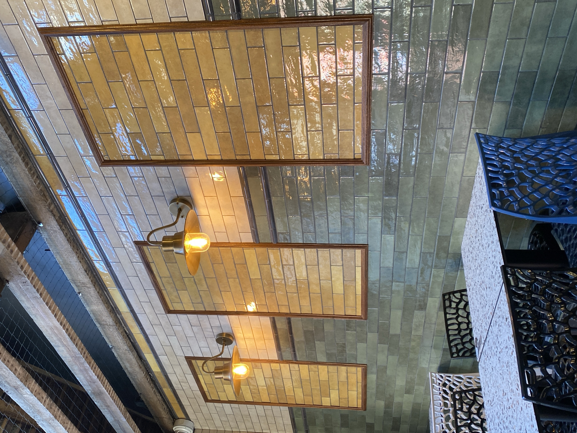 The image depicts the ceiling of a building, possibly a restaurant or pub, in London, United Kingdom. The ceiling is tiled with rectangular tiles in two different colors: a yellowish-tan color and a greenish-grey color. Three rectangular framed panels with yellowish-tan tiles are visible, each illuminated by a vintage-style light fixture with a brass-colored arm and a conical shade. The lighting fixture is mounted to the tile surface. Portions of a table and chair are seen in the right side of the image. The left side of the image shows wooden beams and a net-like structure, suggesting a rustic or industrial design element. The overall impression is that of a modern, yet vintage-inspired interior.