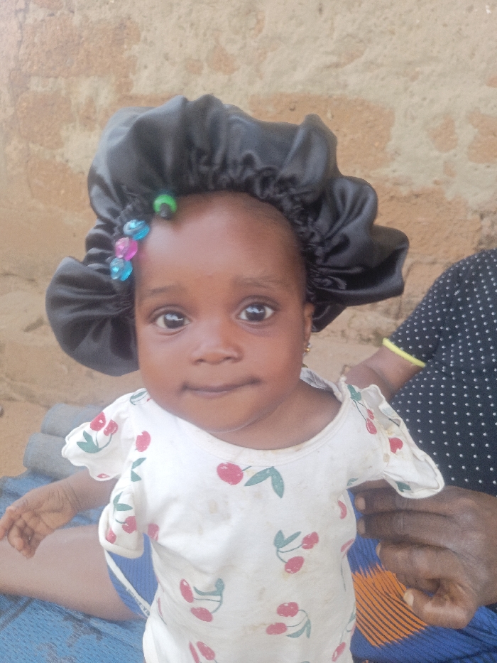 - "A baby with brown skin wears a black satin bonnet decorated with colorful beads" by FM-eoEuF2, licensed under CC BY 4.0