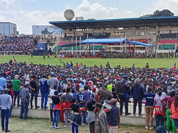 This image depicts a large public gathering within the Moi International Sports Centre (MISC) Kasarani, located in Nairobi, Kenya