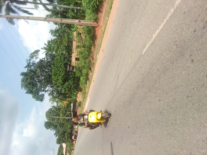A yellow moped is traveling down a paved road, heading toward the viewer, in Nnobi, Nigeria