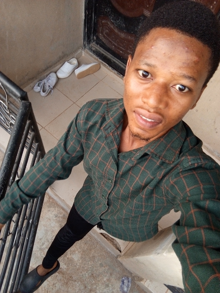 A young man in a green plaid shirt and black pants poses for a selfie. He stands near a black metal railing. On the tiled floor, three pairs of shoes rest near a wall. One pair is white sneakers, another pair is white slip-ons, and the third pair is black sandals. A dark-colored door frame is visible in the background. The man appears to be standing indoors.