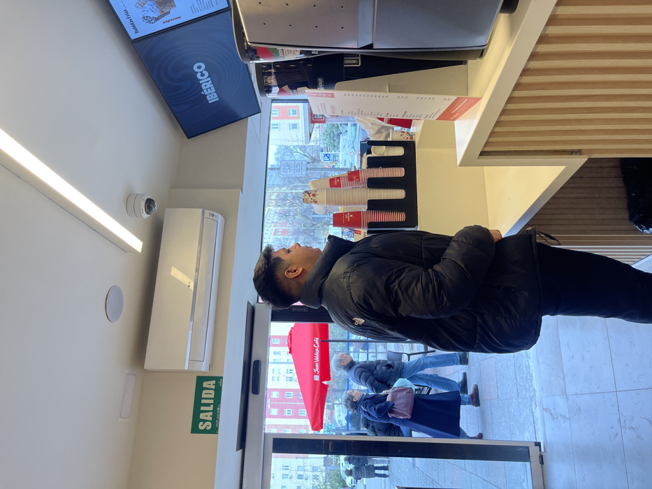 - "The image depicts the interior of a cafe or quick-service restaurant, looking out onto a city street, likely in Madrid, Spain" by FM-Uiavu2, licensed under CC BY 4.0