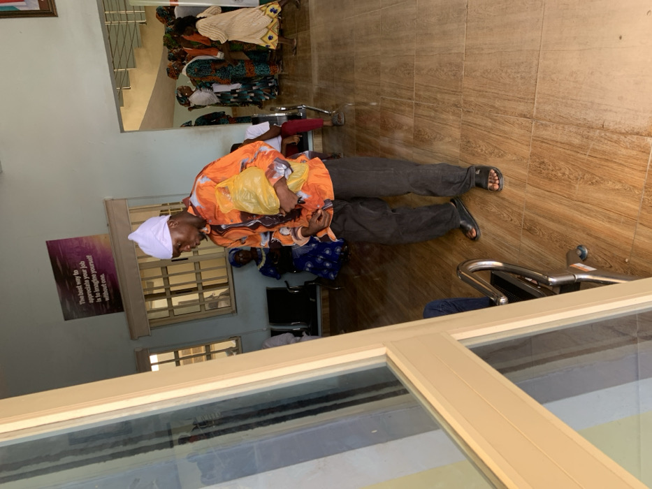 The image depicts an indoor scene in a public building, likely a waiting area or hallway, within the city of Lokoja, Nigeria