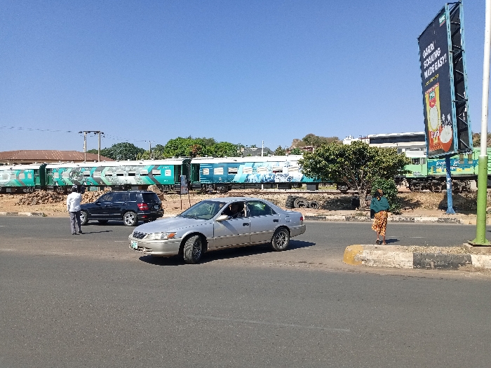 The image depicts an urban thoroughfare adjacent to a railway line, likely in the vicinity of the Jos Terminus Station in Jos, Plateau State, Nigeria, under a clear blue sky