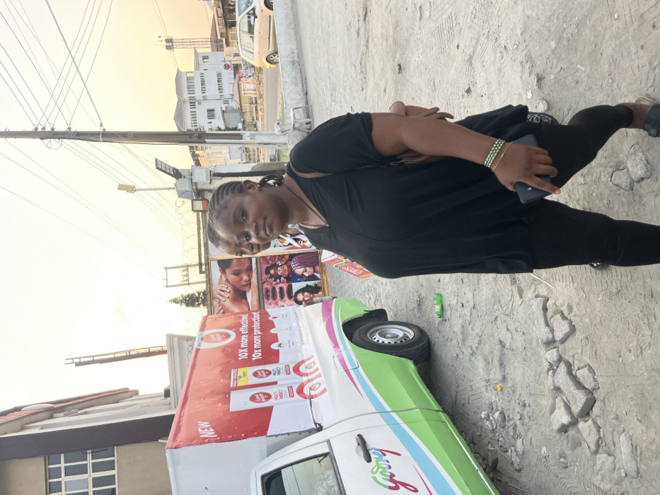 A woman stands next to a parked delivery van with "Goodly" branding. She is dark-skinned and wears a black shirt, leggings, and bracelets, holding a smartphone in her right hand. The van's side features an advertisement for a product offering "10X more effective" and "10X more protection." The background shows a building, utility poles, and a car parked on the street. The ground is uneven with patches of broken concrete.