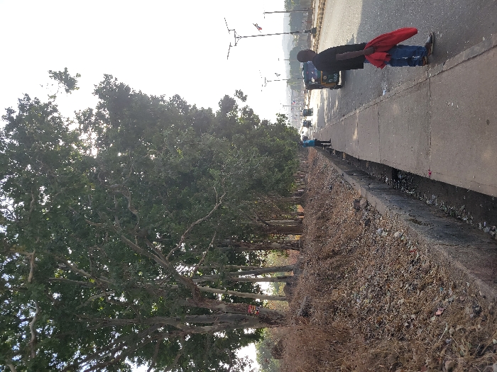 A street view features a row of trees lining the left side. A man stands on the sidewalk holding a red jacket. Further down the road, another person is visible. Vehicles drive on the road. A curb and rocky embankment separate the sidewalk from the street. Overhead wires span the sky.