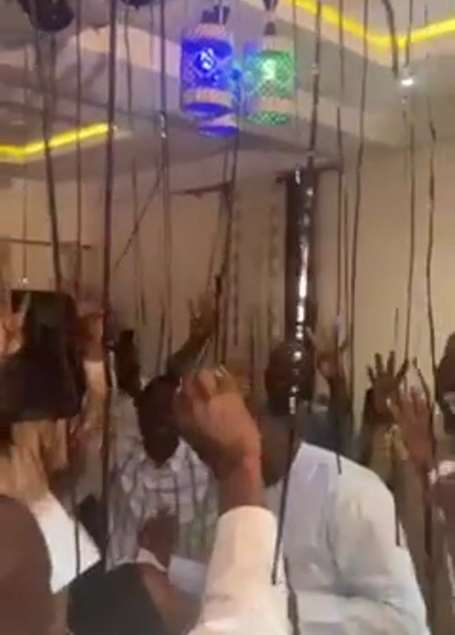 A group of men, mostly dressed in white, are gathered in an indoor space decorated for a celebration. Black and silver balloons hang from the ceiling, interspersed with strands of dark ribbon and several colorful lantern-style lights. The men are raising their hands upwards, some displaying peace signs, apparently participating in a lively group activity or celebration, with others visible in the background.