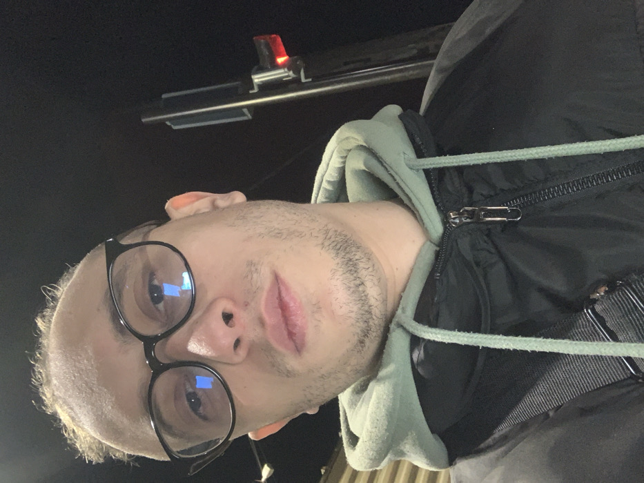 A low-angle selfie captures a person with fair skin, wearing black-rimmed glasses. They have light, short hair and sparse stubble. A light green hoodie is visible under a black vest with a zipper. The background is dark. A metal fixture with a red light sits above. Reflections are visible in the lenses of the glasses.