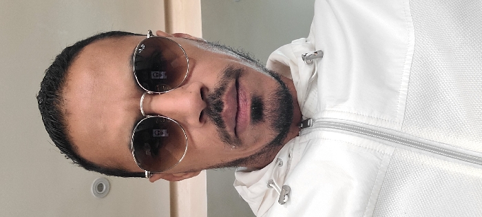 The image displays a frontal, head-and-shoulders portrait of an adult male, captured indoors against a plain, light-colored wall and ceiling. The subject has a medium-brown complexion, dark hair combed back, and a dark, trimmed mustache and goatee. He wears round, metallic-framed sunglasses with dark, gradient-tinted lenses. Reflections within the sunglass lenses reveal an inverted image of the subject's face and a circular recessed light fixture visible on the ceiling. The subject is dressed in a white hooded jacket, secured by a central metallic zipper. The jacket features metallic toggles for the hood's drawstring and incorporates both smooth and textured fabric panels. The immediate environment is an unidentifiable interior space. No specific visual cues or landmarks are present within the image to determine the precise location within the city of Meknes, Morocco.