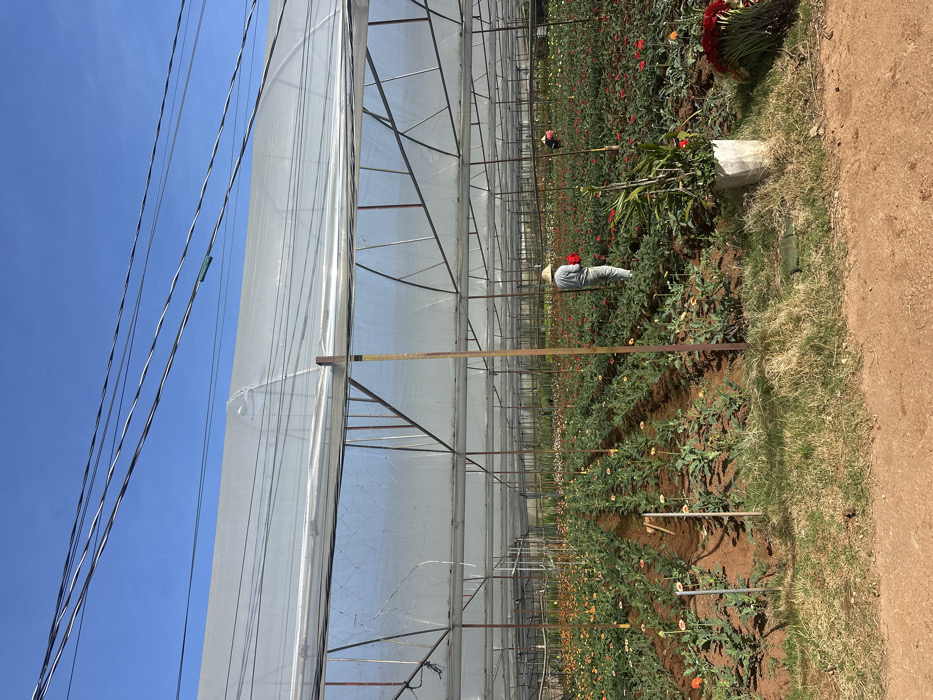 A greenhouse stands tall with a translucent plastic covering and metal framework. Inside, rows of colorful flowers are being tended to by a person wearing a hat and red shirt. A collection of cut flowers sits near the edge of the field, bordering a path with grass and dirt. Power lines stretch across the bright blue sky to the left of the structure.