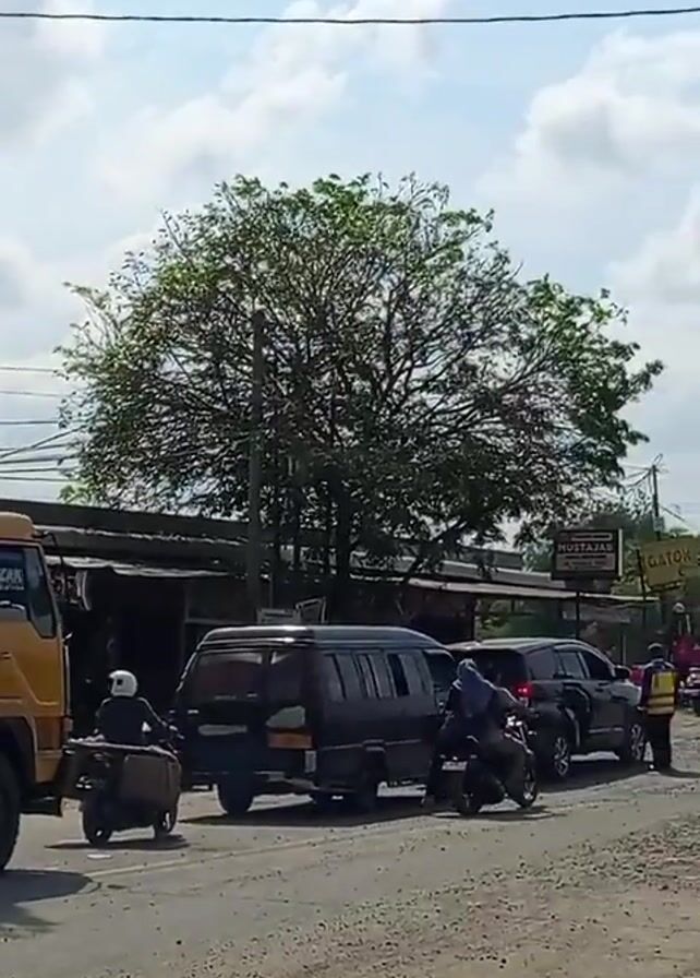 road with several vehicles, including a yellow truck, a black van, and a black SUV, stopped near a road construction site. Two motorcycles with riders are also present. There are people wearing hard hats and vests directing traffic near orange traffic cones and warning signs. One sign says "HATI-HATI KELUAR MASUK KENDARAAN PROYEK," which translates to "CAUTION ENTERING AND EXITING PROJECT VEHICLES." A large tree is visible in the background, along with buildings and a partially cloudy sky.
