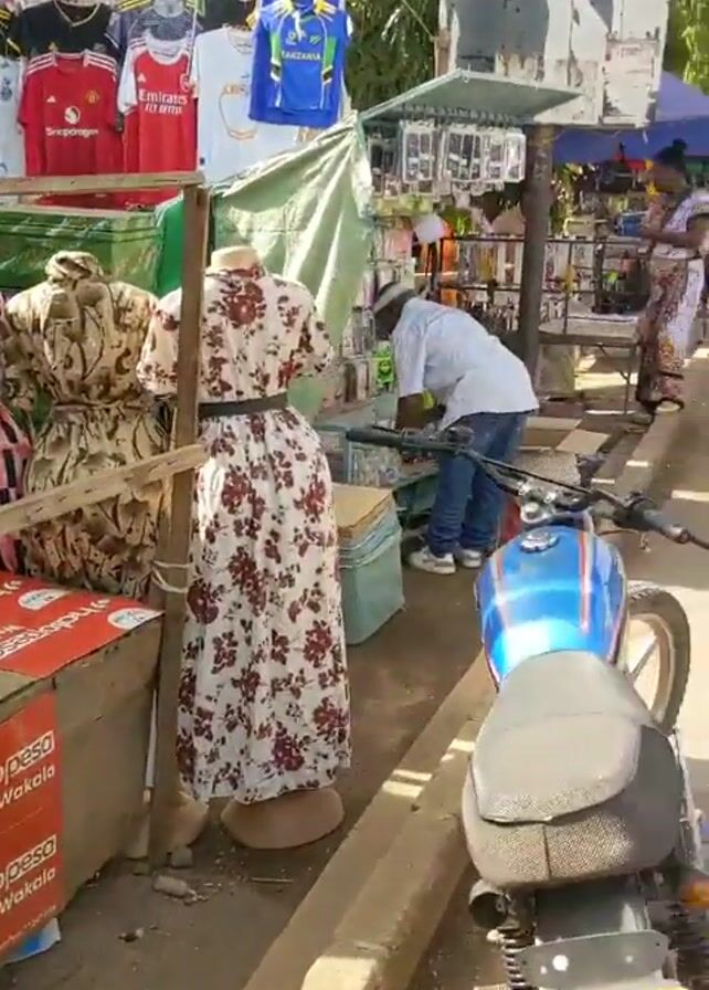 The video depicts a bustling street scene with several vendors displaying their wares along the sidewalk. There's a clothing stall with jerseys and dresses on mannequins, a stall selling phone cases, and another one with jewelry and trinkets. A man in a white shirt and blue jeans is arranging items at the phone case stall, while a woman in a patterned dress browses the jewelry. A blue motorcycle is parked near the phone case stall. The environment appears to be a sunny outdoor market with a mix of pedestrians and vehicles passing by.