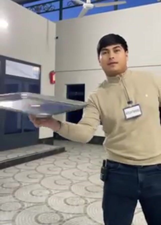 A man is standing in a large, open room with a tiled floor and a ceiling fan. He is holding a rectangular metal tray in his hand and balancing it on his fingertip. He rotates the tray, showing it from different angles. The room appears to be part of a building with windows and doors. The sky is visible through the roof, indicating it might be outdoors or a covered area. The man wears a light-colored, zip-up sweater, dark jeans, and a badge labeled "Volunteer." There is a walkie-talkie clipped to his pants. A fire extinguisher is mounted on the wall behind him.