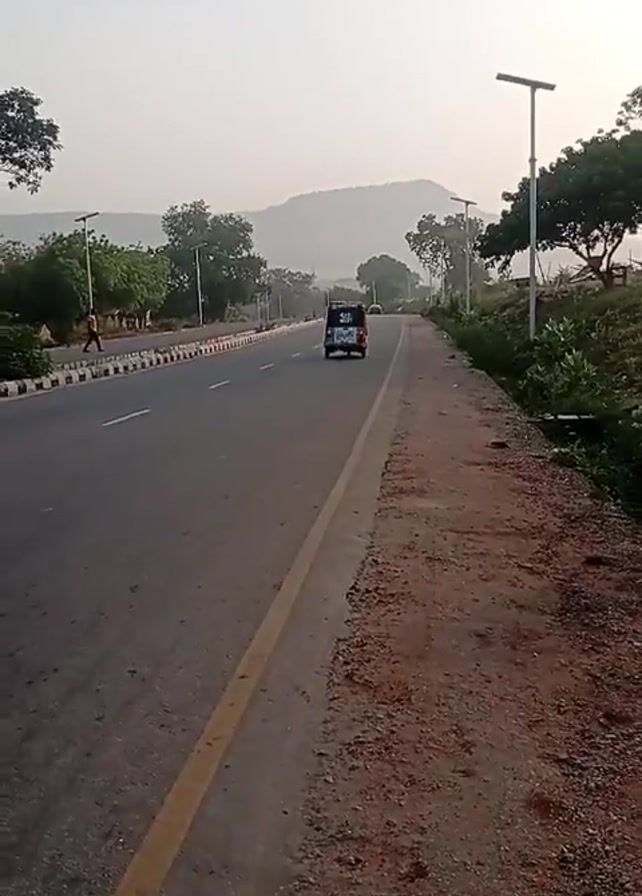 straight stretch of a paved road with two lanes in each direction. The road is marked with a solid yellow line on the edge and dashed white lines separating the lanes. A black SUV is driving in the left lane and a three-wheeled vehicle is in the right lane, both moving away from the camera. The roadside has trees, bushes, and a dirt shoulder on the right side. Solar-powered streetlights are placed along the roadside. In the distance, there's a mountain range under a hazy sky. A few people can be seen walking along the roadside on the left.