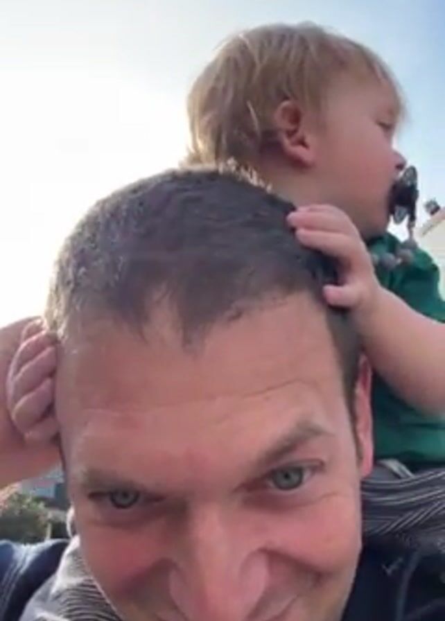 close-up of a man carrying a young child on his shoulders. The man is light-skinned with short, graying hair and blue eyes. He is smiling slightly. The child is fair-skinned with light blonde hair, wearing a green shirt and striped pants. The child has a blue pacifier in their mouth and is holding onto the man's head. The background is a clear, blue sky and a modern building with windows. The camera appears to be held by the man himself, giving a selfie perspective.