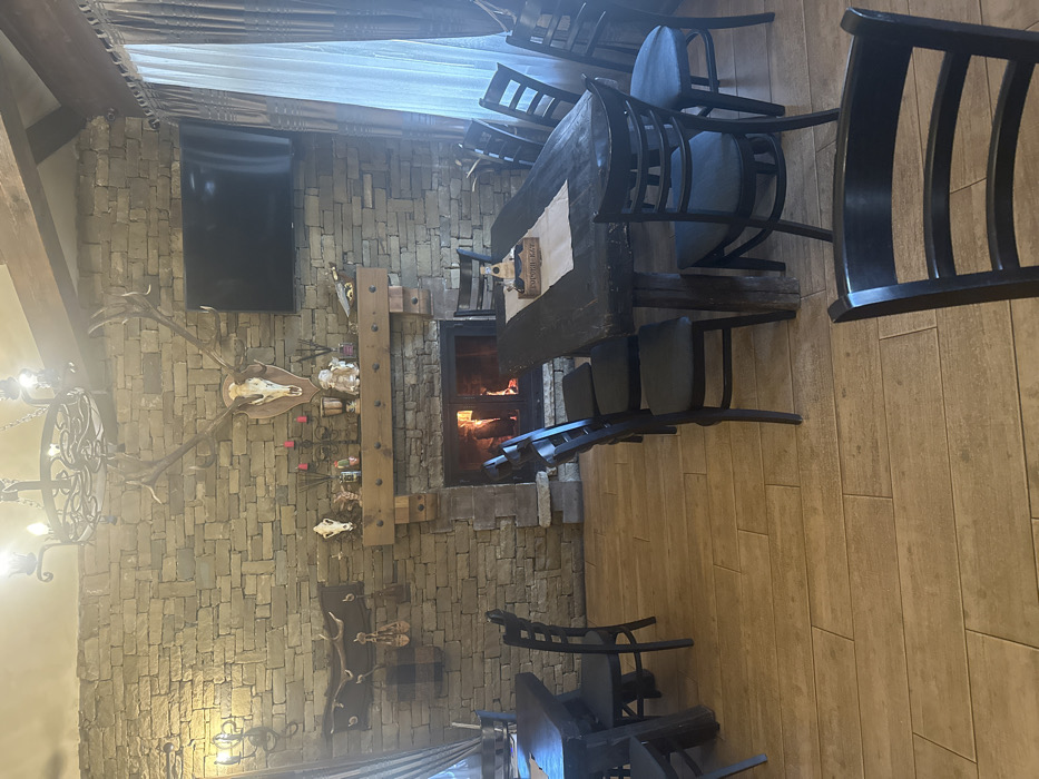 The image depicts the interior of a rustic dining or common area in Oreshak, Bulgaria