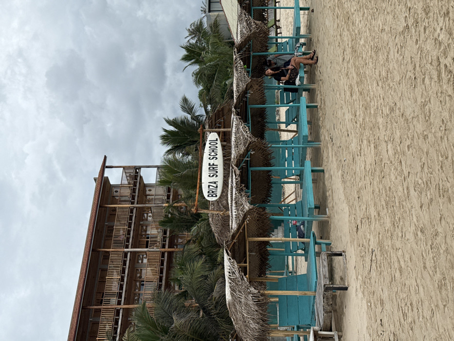 The image depicts a beachfront scene in Kathaluwa, Sri Lanka, under an overcast sky. In the foreground, a sandy beach occupies the lower third of the frame, featuring several rows of light turquoise wooden lounge chairs positioned beneath individual thatched umbrellas supported by wooden frames. A small, weathered wooden table is visible on the far left. In the midground, a white surfboard-shaped sign with "BRIZA SURF SCHOOL" printed in black capital letters is mounted on two wooden poles, situated above the thatched shelters. Two individuals are seated under one of the shelters on the right side of the frame; one person, with dark hair, faces left, wearing a dark top and a patterned skirt, while the second is partially obscured behind them. The background features a multi-story building constructed primarily of wood with numerous balconies and a red-tiled roof, visible above a dense cluster of green palm trees. Another building is partially visible on the far right.