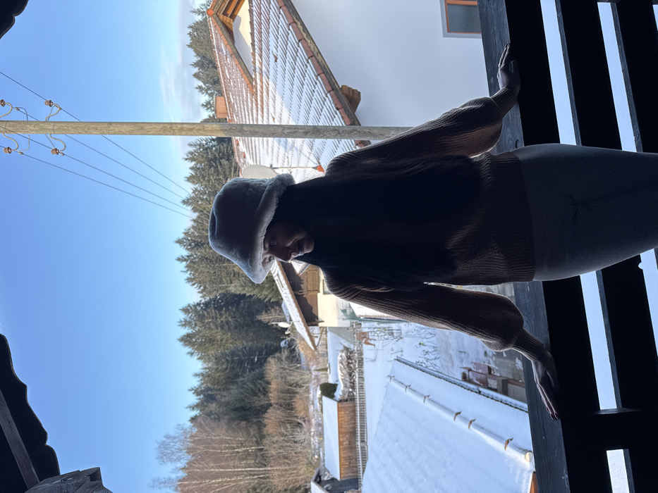An individual, gender appearing female, stands on a balcony in Lohberg, Germany, silhouetted against a bright, clear blue winter sky. The subject wears a light-colored, possibly white or light grey, faux fur bucket hat, a light brown knit sweater with voluminous sleeves, and light-colored trousers. Her long, dark hair is visible below the hat. Both hands rest on a dark wooden balcony railing in the foreground. The scene presents a snow-covered landscape. In the mid-ground, multiple houses with snow-dusted, reddish-brown tiled roofs are visible. A prominent wooden utility pole with multiple insulators and overhead wires is positioned to the right of the subject. A dense coniferous forest dominates the background, with a section of bare deciduous trees on the left. Snow covers the ground and rooftops, indicating winter conditions.