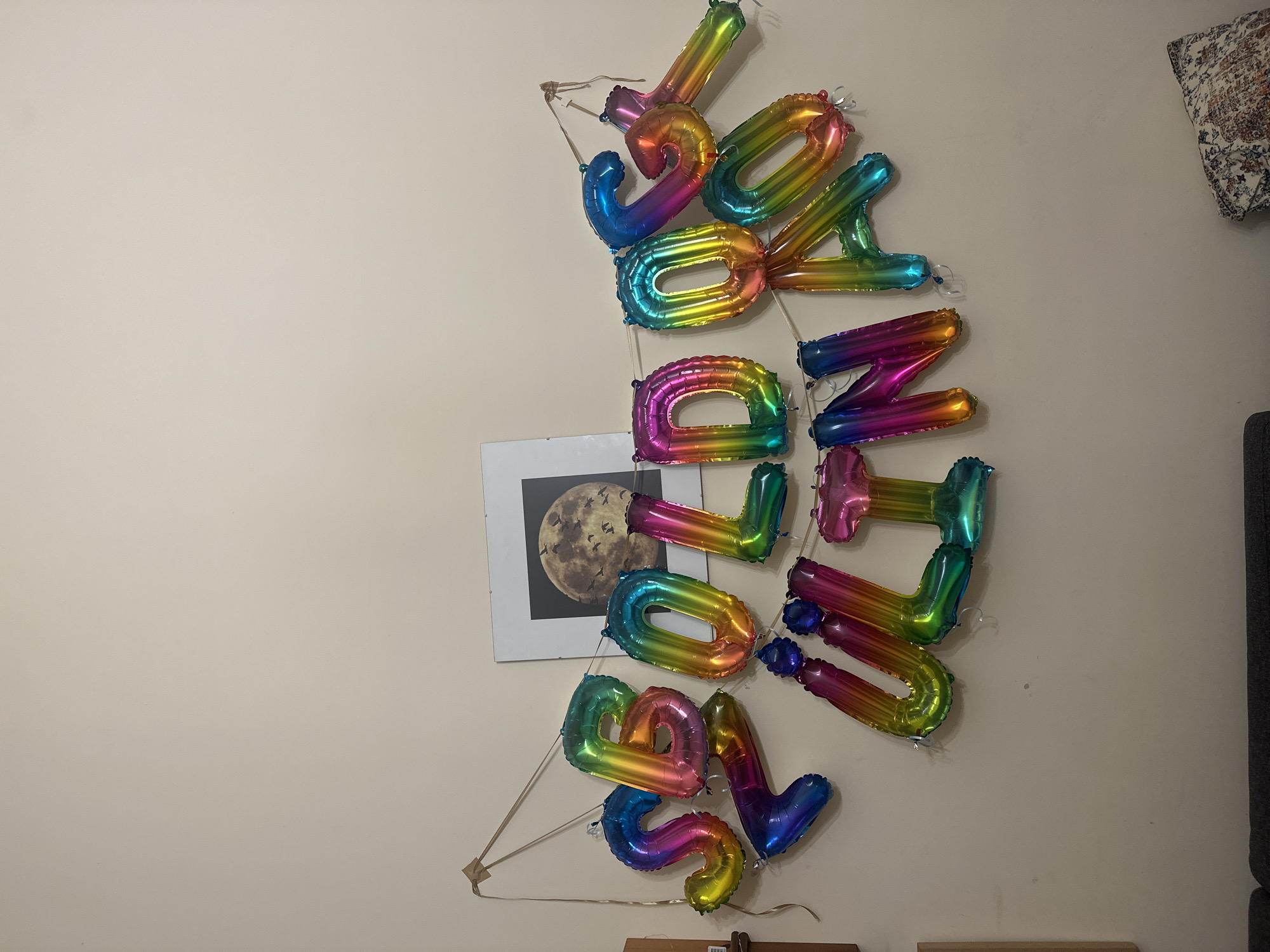 The image depicts an indoor scene in Budapest, Hungary, featuring a celebratory banner against a light beige wall. The banner consists of two rows of inflated, rainbow-colored foil letter balloons spelling "BOLDOG" on the top row and "ULINA" on the bottom row. These balloons are suspended by a light-colored string or ribbon, secured at multiple points on the wall, with a visible light brown, triangular attachment on the upper left. A white-framed picture hangs on the wall, partially obscured by the balloons, displaying an image of a full moon with multiple bird silhouettes in flight. The bottom of a dark grey upholstered furniture piece, likely a sofa, is visible at the bottom of the frame, with a patterned cushion featuring blue, brown, and orange designs located in the lower right corner.