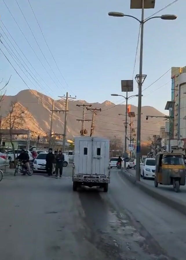 street scene with a van-like vehicle moving along a wet road. The vehicle has a boxy, metallic structure with two window-like openings in the back. The street is flanked by buildings on both sides, with cars and motorcycles parked along the edge. In the background, mountains are visible under a clear sky. Power lines and utility poles crisscross above the street. Several people are visible on the sidewalks, some walking and others standing. The road appears to be slightly damaged, with patches of asphalt and uneven surfaces. Other vehicles, including a tuk-tuk, are also present on the road. A flag is visible on a pole beside the road.