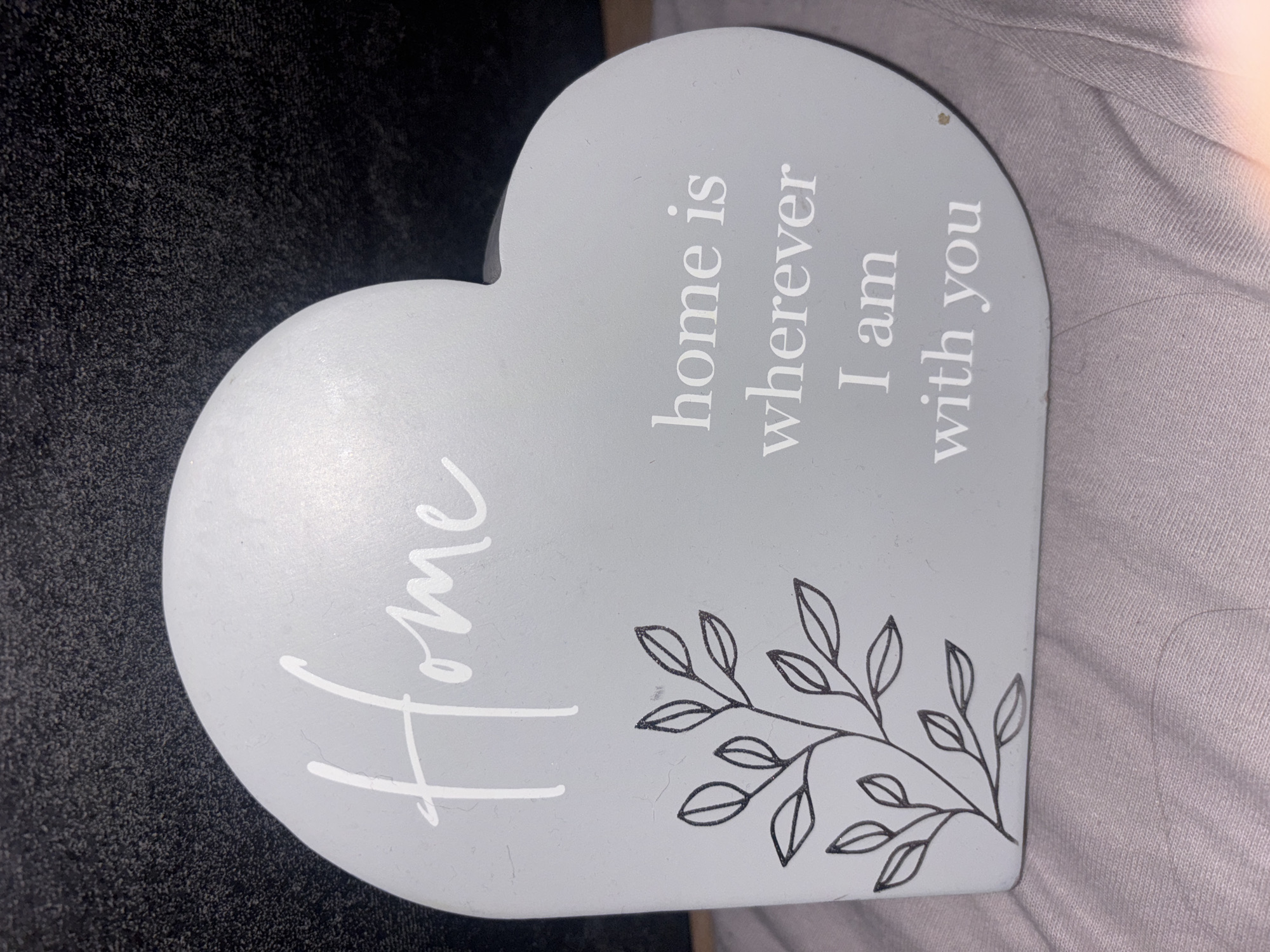 heart-shaped plaque resting on two different surfaces, one is a dark, rough textured fabric and the other is light colored, smooth fabric. The plaque is light gray and has the word "Home" written in a cursive font in the lower left. To the right is the text "home is wherever I am with you" in a sans-serif font, aligned vertically. Below the text is a decorative illustration of a leafy branch. The image does not contain enough information to be located in Burgas, Bulgaria.