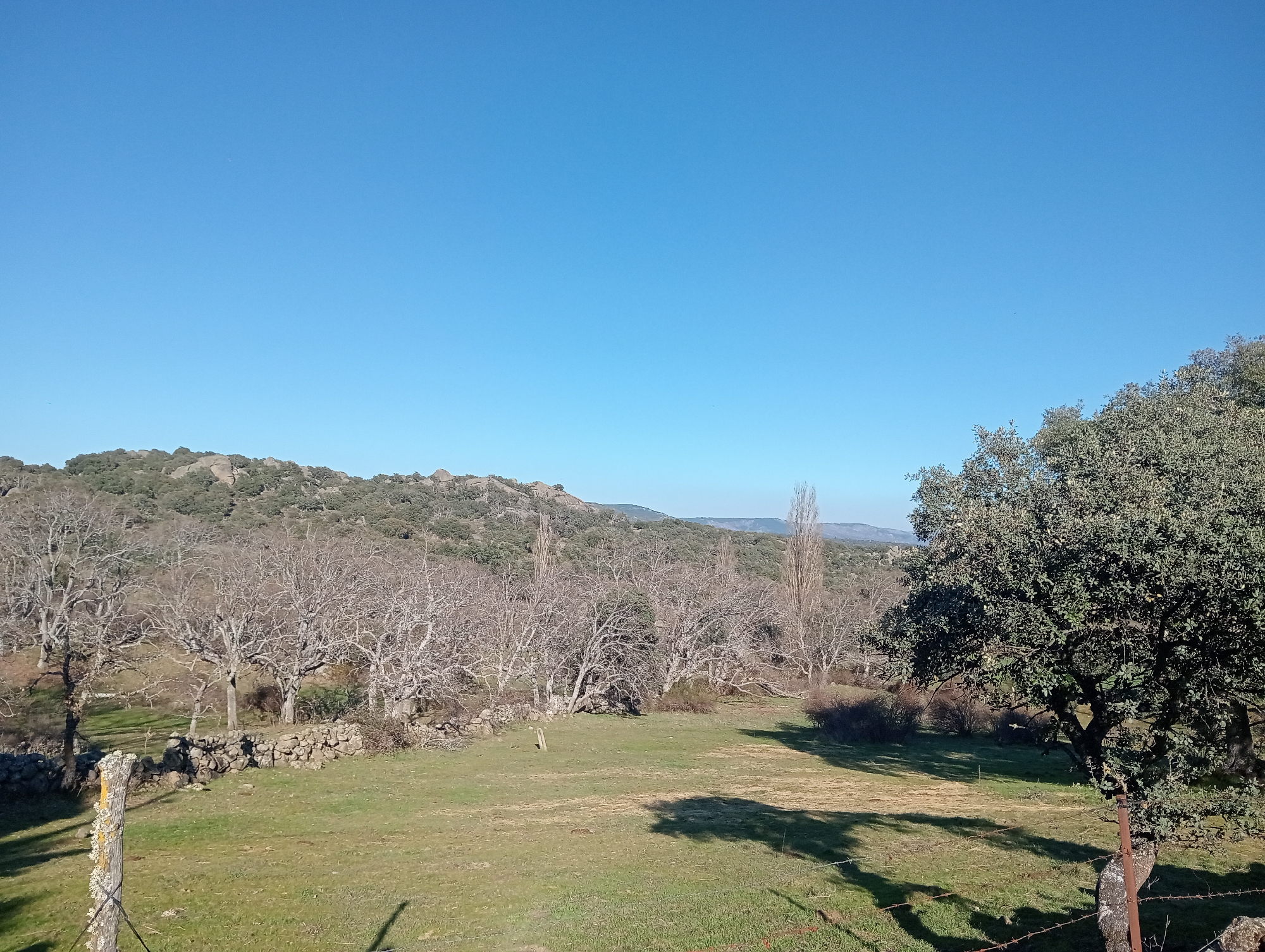 This image depicts a rural landscape near Collado del Mirón, Spain, under a clear, bright blue sky. The scene is characterized by a grassy field in the foreground, showing variations in green and light brown hues, indicating a dry period or dormant grass. A weathered wooden fence post, partially covered with lichen, is visible in the lower-left, and a rusty metal fence post with barbed wire is present in the lower-right. Both posts cast shadows to the left, suggesting morning or late afternoon sun from the right. The midground features a low, dry-stacked stone wall traversing horizontally across the frame. Behind this wall, a cluster of numerous deciduous trees, primarily oaks or similar species, stand bare of leaves, indicating winter or early spring. Several taller, very slender deciduous trees are also scattered among them, similarly leafless. To the far right, a large evergreen tree with dense, dark green foliage is prominent, also casting a significant shadow onto the field. In the background, a range of hills or mountains rises, sparsely covered with scrub vegetation and numerous exposed rock formations. The distant horizon under the unbroken blue sky shows no clouds. No people, animals, or specific activities are observable within the frame.