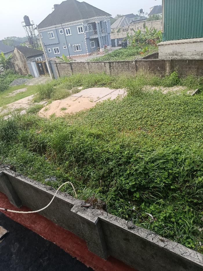 A view of unkempt terrain reveals a mix of dense green ground cover and tall grasses. In the background, a grand, gray house with a dark roof stands out, flanked by other buildings and overgrown vegetation. A concrete wall, topped with barbed wire, lines the foreground. A white tube runs along the wall. A patch of bare earth is visible in the midground. The overall atmosphere suggests neglect and the need for landscaping.