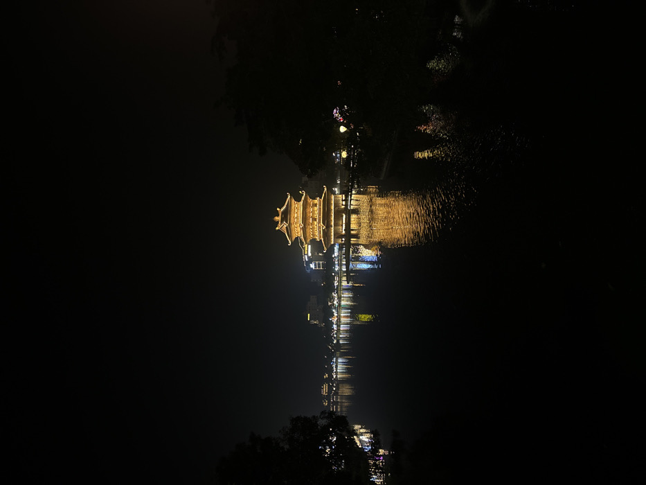 A nighttime view displays a pagoda illuminated in golden light, reflected in the dark water below, creating a mirrored effect