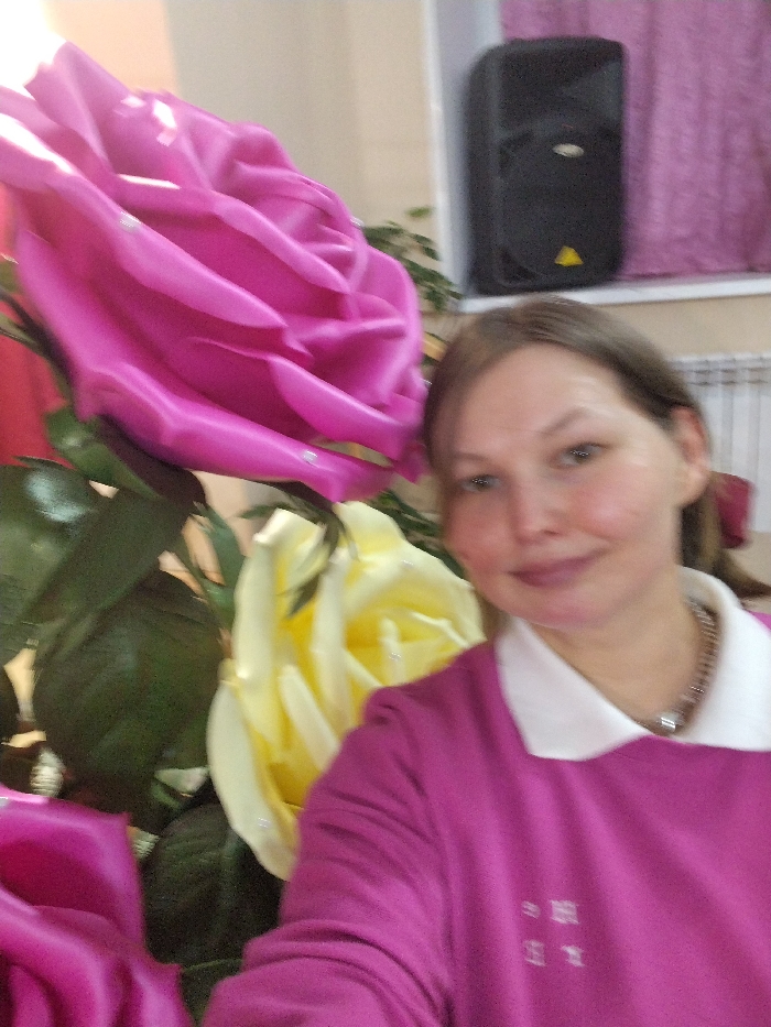 This image depicts an indoor scene in the city of Дойная, Russia. An adult female, with fair complexion and light brown hair, is captured from the chest up, smiling faintly and looking directly into the camera. She is wearing a magenta long-sleeved top with a white collar and a silver-colored chain necklace featuring a circular pendant. Small white embroidered symbols are visible on the left chest area of her top. The left side of the frame is largely occupied by large, artificial fabric roses: a prominent magenta rose with reflective embellishments in the upper left, a yellow rose below it, and a partial view of another magenta rose at the bottom left, all interspersed with green artificial leaves. In the background, on the right side of the frame, a black rectangular speaker with a yellow triangular emblem is mounted on a light-colored wall. Below the speaker, a white radiator with horizontal fins is present. A purple curtain is partially visible behind the speaker and radiator.