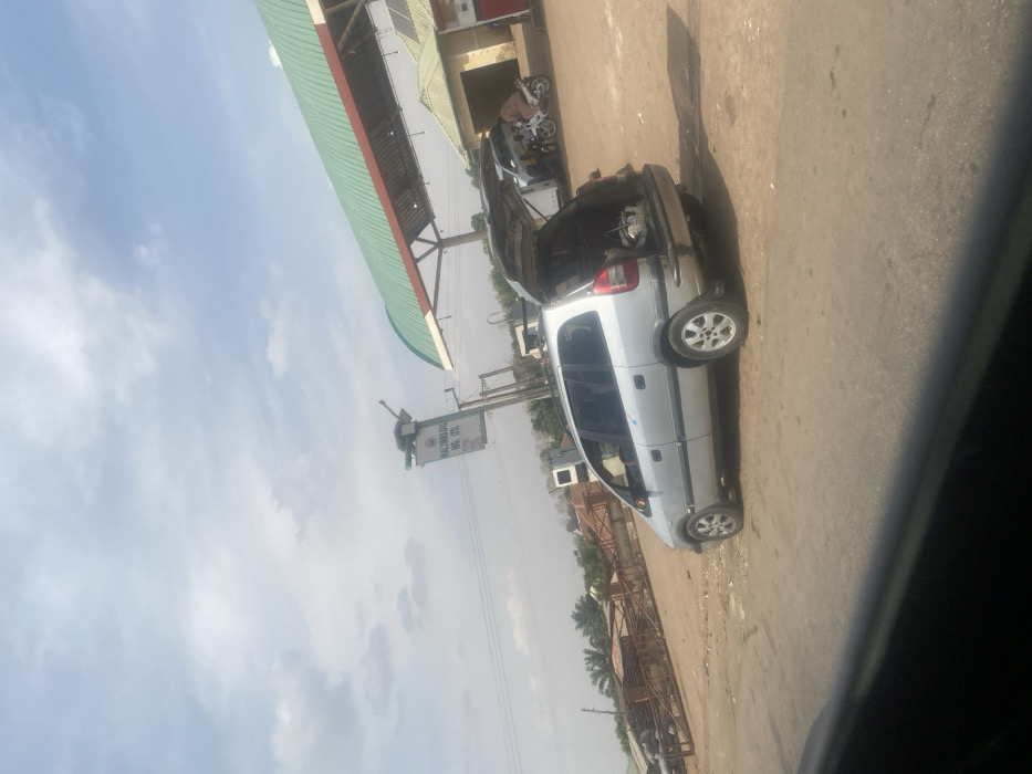 The scene depicts a silver minivan parked on an unpaved surface at a fuel station in Karshi, Nigeria