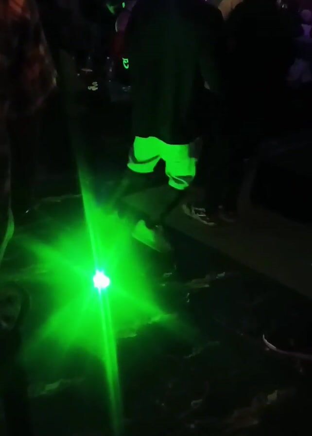 dimly lit indoor setting, possibly a club or party, with several people moving in the background. The scene is dominated by a green and then blue light source that casts strong, starburst-shaped rays on the dark floor. The floor appears to have a marble or textured pattern. One person, seen from behind, is wearing dark clothing, light-colored shorts that glow under the light, and a hat. This individual is moving or dancing. Other people are visible in the background, but their details are obscured by the low lighting.