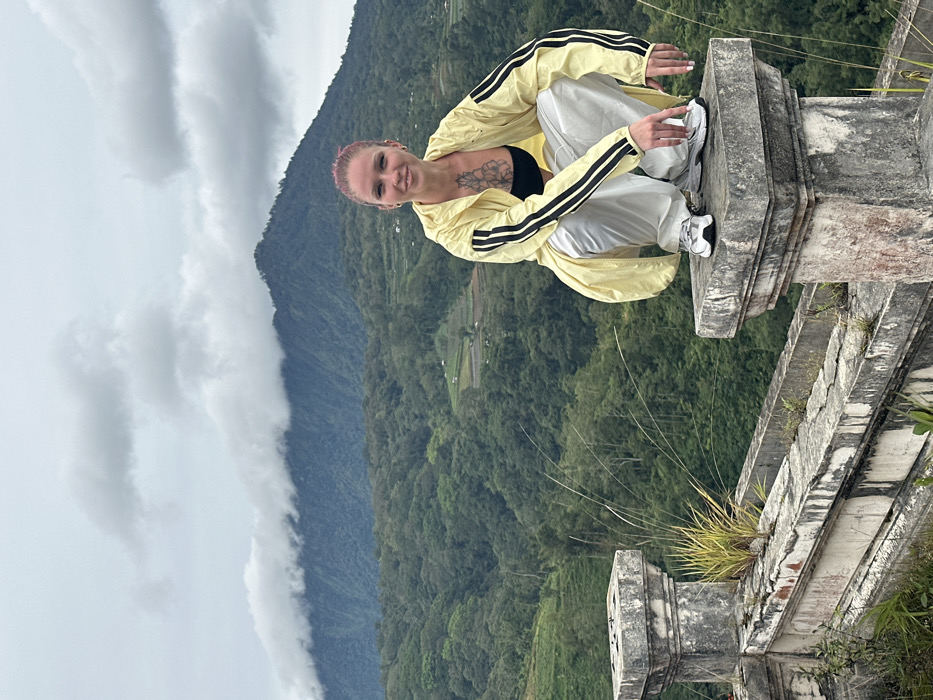 A single female individual is centrally positioned, crouched atop a weathered stone pillar that forms part of a dilapidated balustrade in the city of Mekarsari, Indonesia. The woman, with light skin and short reddish hair, wears a light yellow jacket with black stripes, a black crop top, light grey baggy pants, and grey sneakers. A floral tattoo is visible on her upper chest. She is smiling and looking directly at the viewer. The foreground features the crumbling, plant-overgrown stone balustrade. The background showcases a vast, densely forested mountain range under an overcast sky with grey clouds, some partially obscuring the mountain peaks. Agricultural terraces are visible on the distant mountain slopes.