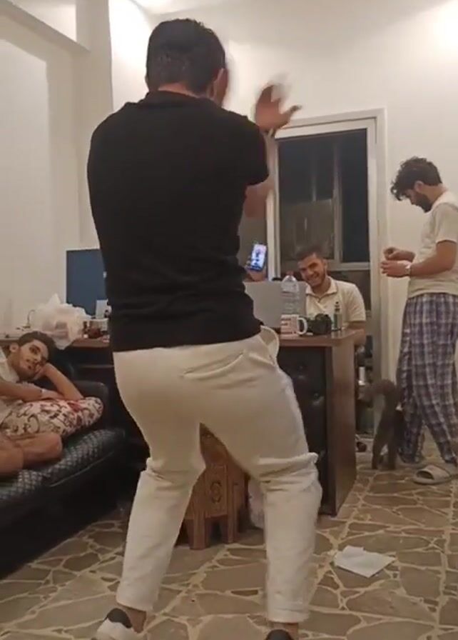 A man in a black shirt and white pants is dancing in a room with other people. There is a man lying on a couch and another man standing by the window, looking at his phone. There is a desk with a laptop and a water bottle on it, and a man is sitting at the desk. The room has a patterned floor and a white ceiling. There is music playing in the background.