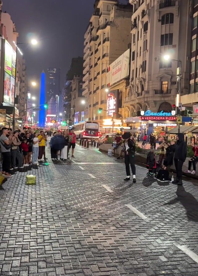 - ". The video is taken outdoors at night, showcasing a street performance in a city. The street is paved with cobblestones and lined with tall buildings. The city’s obelisk is visible in the background. A crowd of people is gathered on the left side of the street watching the show. A person wearing a black and white outfit is dancing in the street. Other people, possibly musicians, are seated on the right side of the street. The lighting comes from street lamps and building lights, creating a vibrant urban atmosphere. The overall impression is that of a lively street scene with an impromptu performance entertaining the public." by FM-YvemP2, licensed under CC BY 4.0
