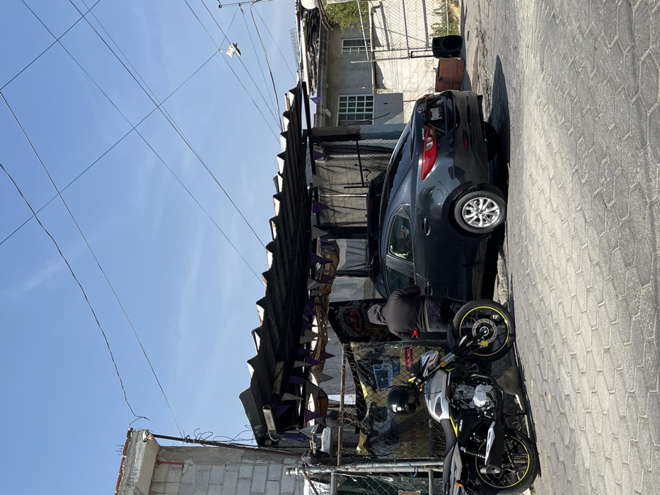 A street scene shows a dark car parked next to a makeshift structure decorated with purple pennants. A person bends over near a motorcycle with bright yellow rims. The building behind the car is gray with white windows. Power lines crisscross the clear blue sky. The ground is paved with gray stones. Another partially visible building is on the left.