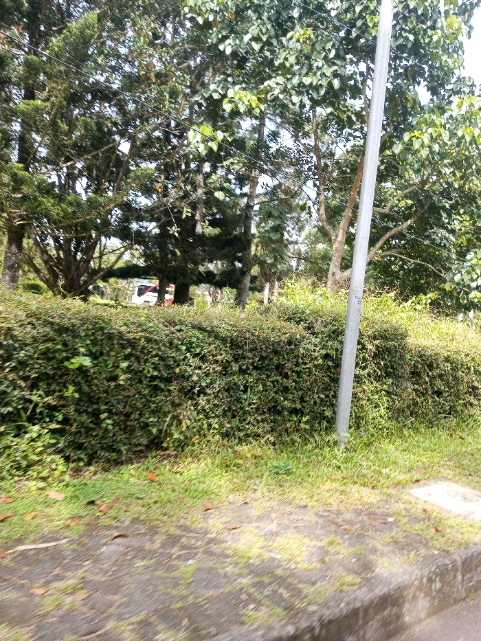 A daytime outdoor scene in Namthoung, Laos, depicts a verdant roadside environment. In the foreground, a concrete curb transitions into a strip of green grass interspersed with scattered brown leaves. Extending horizontally across the mid-ground is a dense, well-trimmed green hedge. A light gray, vertically oriented pole, likely metallic, stands to the right of the hedge. Behind the hedge, a thick canopy of diverse green trees is visible, obscuring much of the background. Partially discernible through the foliage in the upper-left background is a white vehicle with red accents, possibly an emergency vehicle or a van. No individuals are present, and no actions or interactions are depicted.