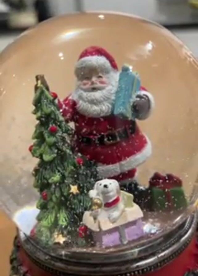 snow globe with Santa Claus in the center. He stands next to a green Christmas tree and holds a blue wrapped gift in his left hand. At his feet is a white dog sitting in a purple present box. Another green present sits behind the dog. The snow globe is filled with fake snow that has been shaken up. The snow globe's base is red and ornate with gold detailing. The video is taken at a close angle.