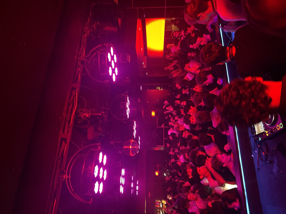 The image captures a densely populated event inside Big Night Live, a nightclub located at 110 Causeway Street in Boston, Massachusetts, United States. The venue is illuminated by a dominant magenta and red lighting scheme, emanating from multiple overhead LED stage lights mounted on a metal truss system. A disco ball is suspended from the ceiling, reflecting light. A notable feature on the right wall is a large, circular, glowing orange-yellow light fixture. In the immediate foreground, a DJ console is visible, displaying illuminated screens and controls, indicating active use. The back of a person's head with curly hair, positioned in front of the console, suggests a DJ or assistant, with another individual wearing a dark shirt and lanyard to their right. A blue-lit railing separates this elevated area from the main floor. The main floor is packed with a large crowd of young adults, mostly male, dressed in casual attire including t-shirts and hoodies. Individuals are standing closely together, engaged in typical nightclub activities such as dancing and socializing. Several green "EXIT" signs with red lettering are visible on the far walls, indicating emergency egress points. The scene conveys a crowded, high-energy environment.