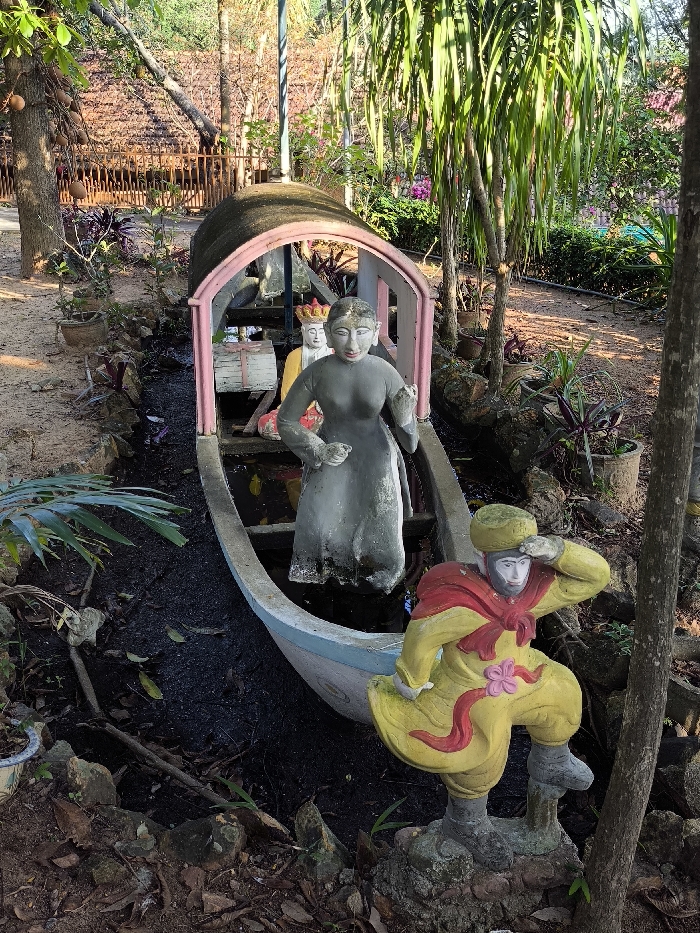 An outdoor sculptural display is depicted in Thành phố Tuy Hòa, Vietnam. A light blue and white stylized boat, featuring a grey arched canopy with pink trim, rests within a narrow, dark water channel containing murky liquid. Inside the boat, a grey female statue stands at the front, followed by a yellow-robed male statue with a red crown, and a partially visible third grey statue further back. All figures in the boat face forward. Positioned on a rocky base to the immediate right of the boat is a statue of Sun Wukong, depicted in yellow robes with red accents, a green turban, and grey boots, in a crouching stance with his right hand raised to his brow, scanning the horizon. The surrounding ground consists of dark earth and scattered dry leaves, bordered by various potted plants and small shrubs. In the left background, a wooden fence and a building with a textured roof are visible amidst trees, one bearing large, round fruit. The right background features a dirt path, additional potted plants, and lush green foliage under natural sunlight.