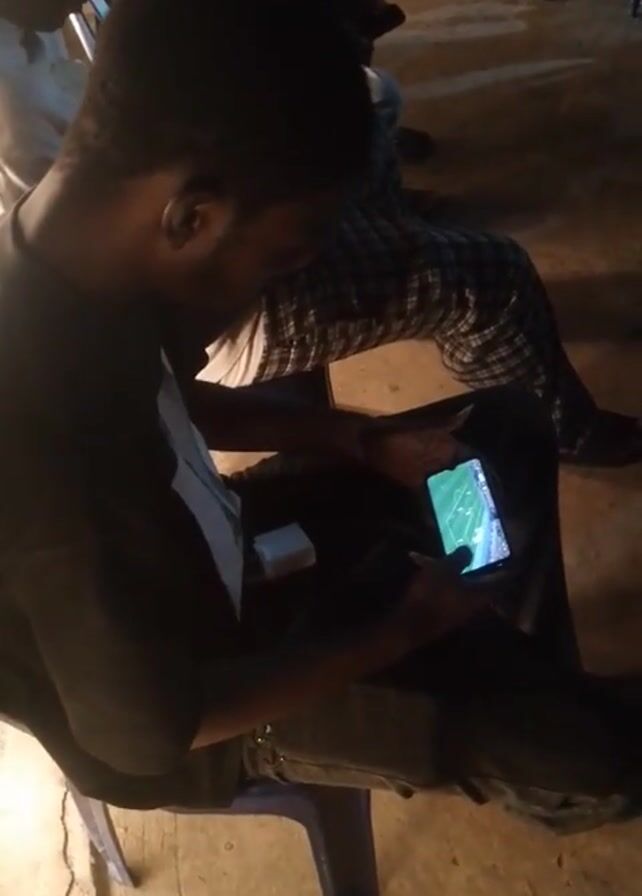 group of people sitting on plastic chairs in an indoor setting. The main focus is on a man in the foreground wearing a dark t-shirt and jeans, who is looking down at his smartphone. The phone's screen is lit up, showing what appears to be a sports game. There is a white object, possibly a phone charger, resting on his lap. Other individuals are seated nearby, some also looking at their phones. The floor appears to be tiled or concrete. Overall, the lighting is dim, giving the scene a slightly somber atmosphere.
