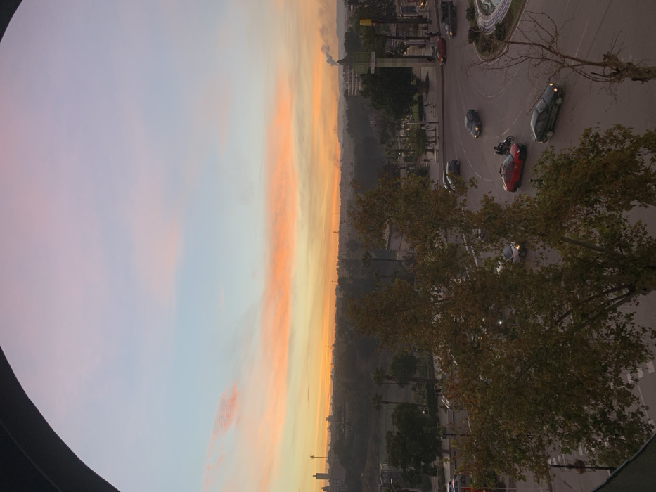 A high-angle view captures an urban landscape at sunset. The sky is a blend of pink, orange, and yellow hues. Below, a city unfolds with trees lining a road, and buildings visible in the distance. Cars and a motorcycle are on the road, suggesting active city life. The image, possibly taken from a high vantage point like a rooftop or tall building, is rotated to the side.