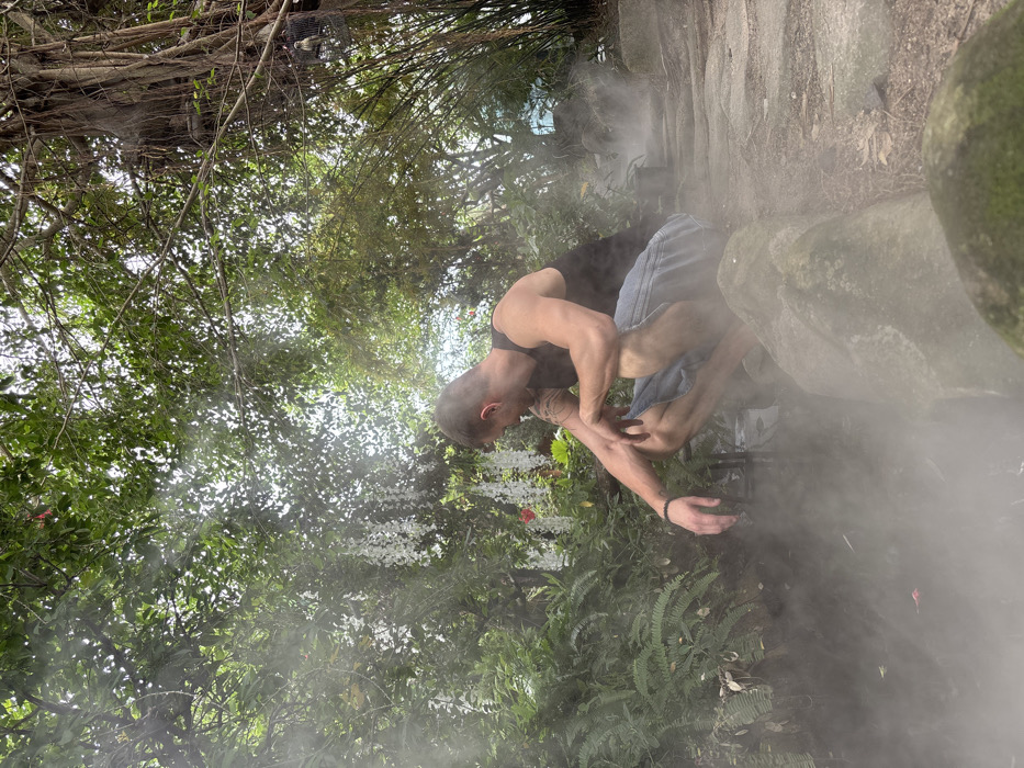 An adult male is captured in a crouching position beside a mist-emitting water feature within a lush, tropical garden setting, likely at the Thap Ba Hot Mineral Spring Center in Nha Trang, Vietnam
