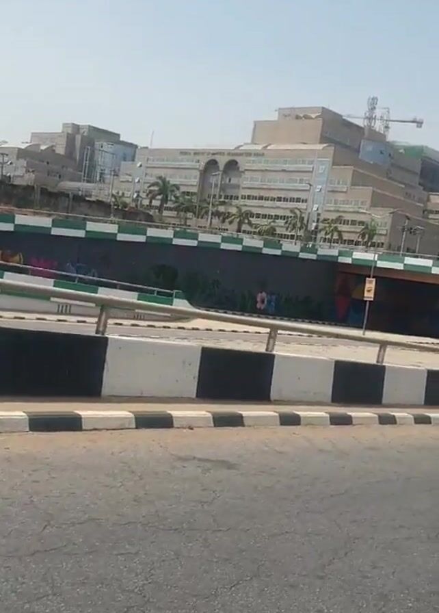 The video is taken from a moving vehicle driving on a paved road in an urban setting. On the right-hand side of the road, there is a pedestrian barrier painted with alternating black and white stripes. Behind the barrier, an overpass or bridge structure is visible. The underpass area of the bridge is adorned with graffiti. In the background, there are several tall buildings, some of which appear to be under construction, as evidenced by a crane. A dark-colored SUV passes by on the road. The sky is clear and appears to be during daylight. In the background, the sound of a car horn is audible.