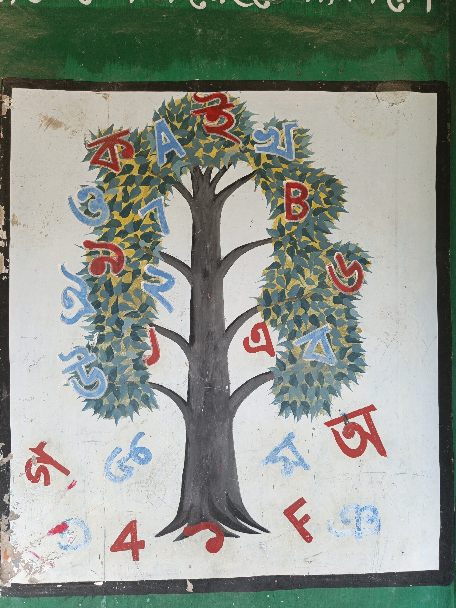 The image displays a vertically oriented, close-up view of a hand-painted mural on a wall in Kauria, Bangladesh. The mural depicts a stylized tree with a dark grey trunk and branches, surrounded by a dense canopy of small, pointed leaves rendered in shades of dark green and yellow. Numerous characters, including Bengali script letters (such as 'ক', 'আ', 'খ', 'গ', 'ঘ', 'ঙ', 'চ', 'ছ', 'জ', 'ঝ', 'ঞ', 'ট', 'ঠ', 'ড', 'ঢ', 'ণ', 'ত'), Latin alphabet letters (A, B, F), and Arabic numerals (4, 6), are painted in red and light blue. These characters are integrated within the tree's foliage and scattered across the white background surrounding the tree's base. The entire mural is framed by a thick black border. The wall immediately above and below the mural is painted a solid dark green; faint white Bengali script is visible at the very top edge of the upper green section. The white surface of the mural exhibits signs of wear, including scuffs, scratches, dirt marks, and minor paint chipping along its edges and surface. No individuals, actions, or interactions are present in the scene.