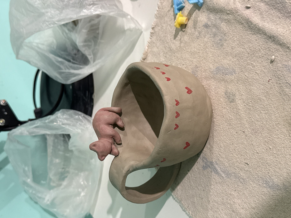 The image displays a beige, unglazed clay vessel, resembling a mug or small pot, positioned on a light beige woven cloth. The vessel features a handle on its left side and is decorated with multiple small, red heart-shaped motifs painted on its exterior. A small, pink, unglazed clay figurine, shaped like a four-legged animal, is perched on the rim of the vessel, oriented towards the right. To the right of the vessel, on the same cloth, are several small plastic objects in yellow and blue. The background shows a white surface with two transparent plastic bags and a dark, metallic stand partially visible. The wall behind is a light teal. This indoor scene is located in the city of Yerevan, Armenia.